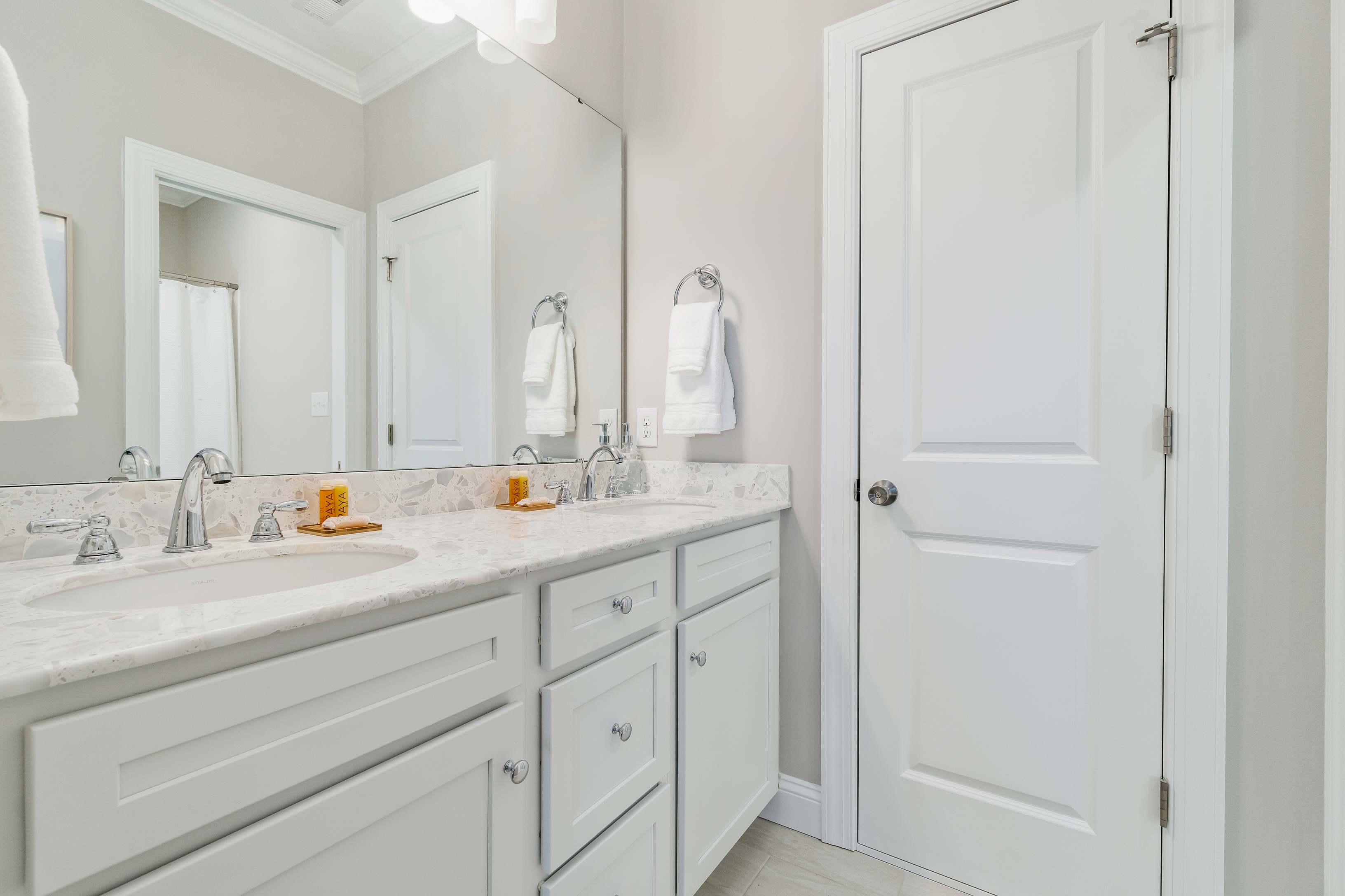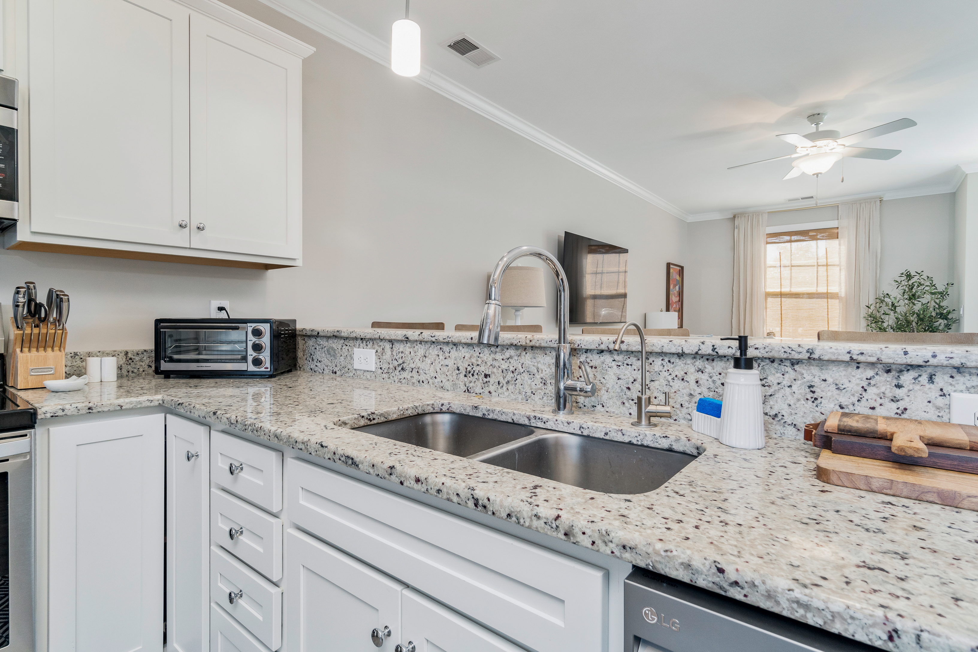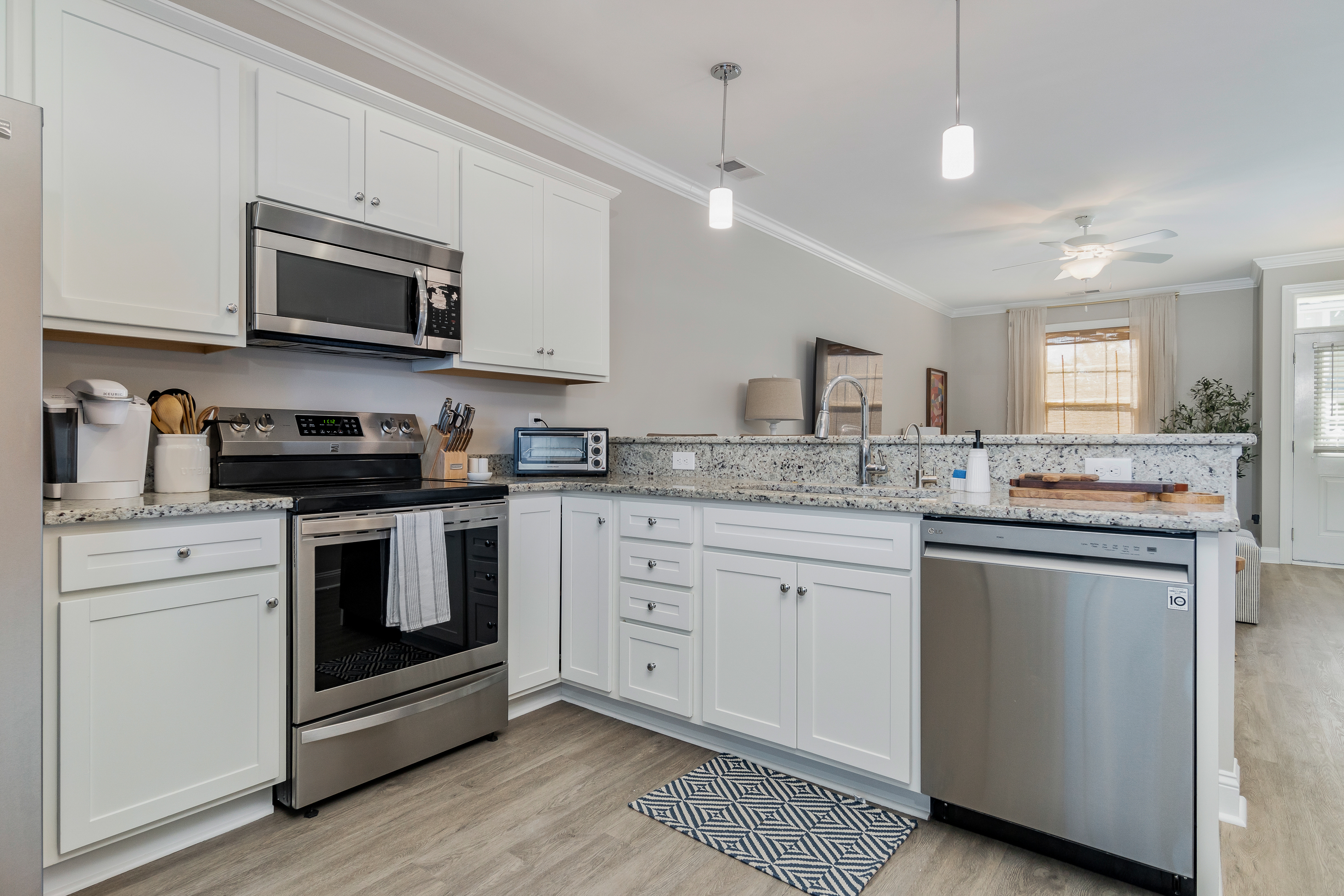 Kitchen is fully stocked for cooking and includes a Keurig coffee maker, blender, and toaster. Bedrooms are complete with high quality linens and plush hybrid memory foam mattresses. A starter set of paper products, garbage bags, and bath towels are provided. Front door has a convenient coded lockbox for easy check-in.